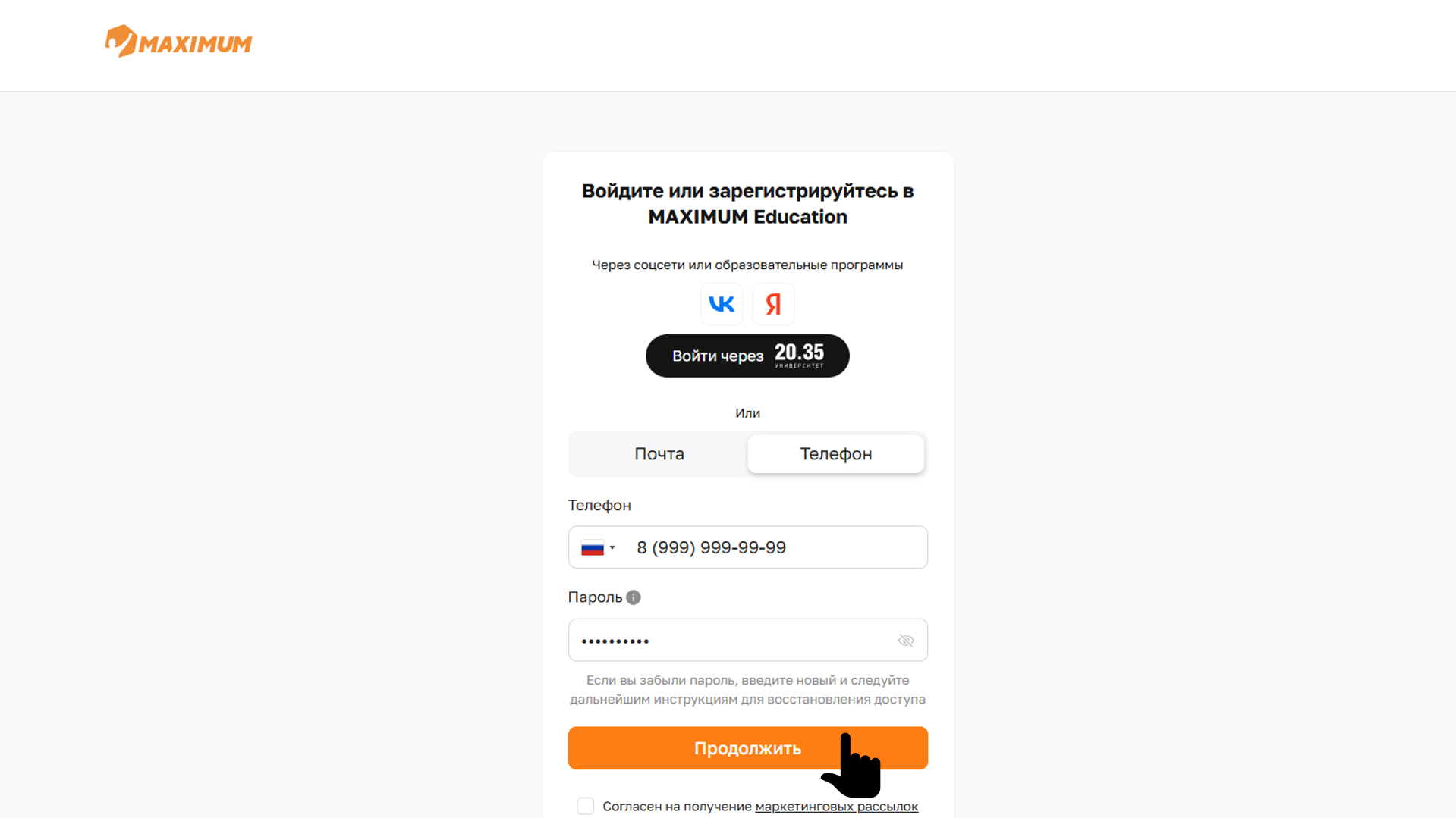 Если для регистрации вы использовали номер телефона, то введите в поле Телефон свой номер, а в поле Пароль введите новый пароль и нажмите Продолжить