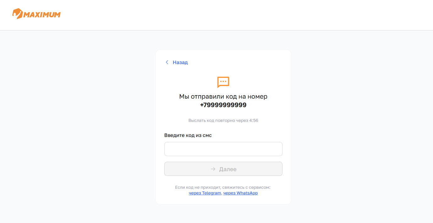 После этого на указанный вами номер придёт СМС с кодом, введите его в специальное поле и нажмите Далее