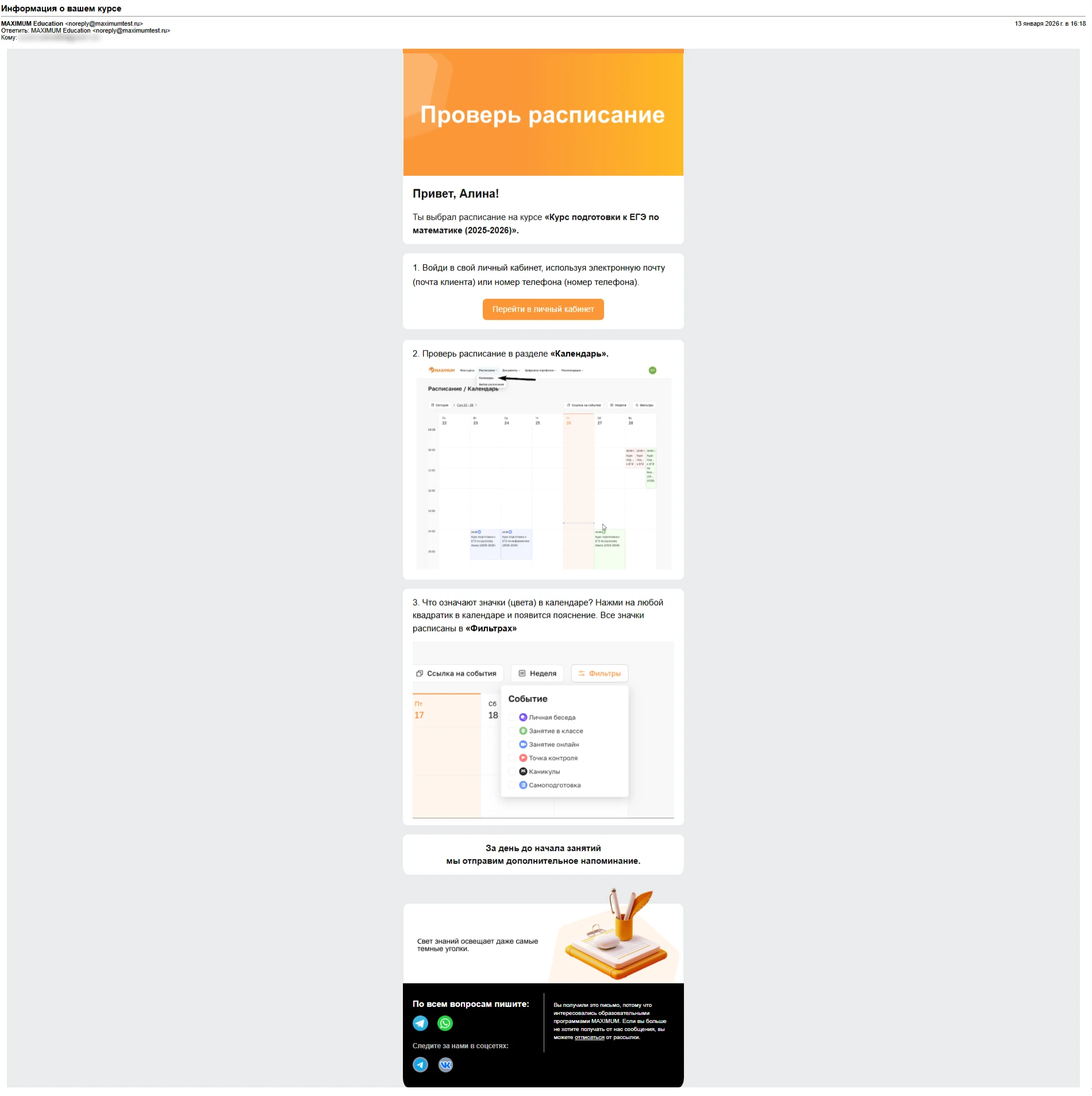 В письме мы укажем название курса, добавим ссылку на личный кабинет: