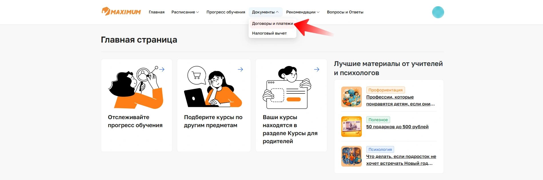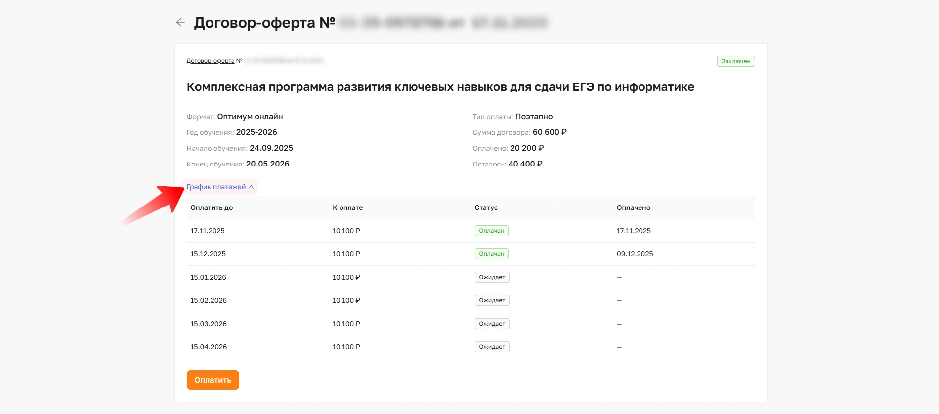 На странице будет информация по всем заключенным договорам. Нажмите на нужный курс, чтобы увидеть более подробную информацию.