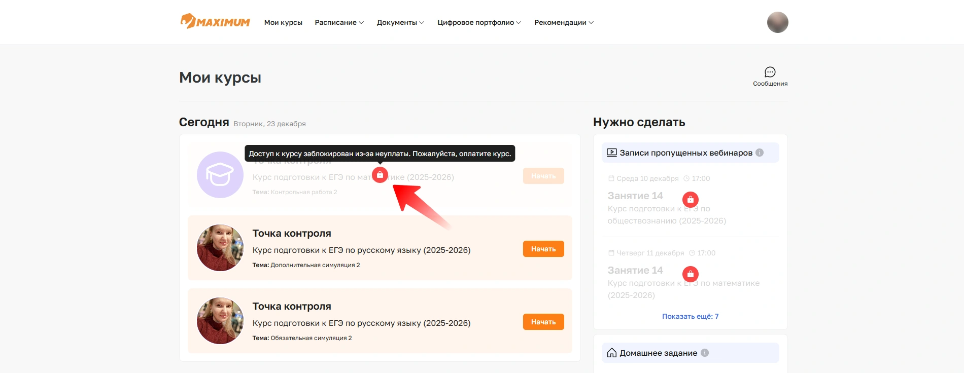 Курс в личном кабинете может быть заблокирован по причине задолженности (если платеж не был внесен согласно графику оплаты).