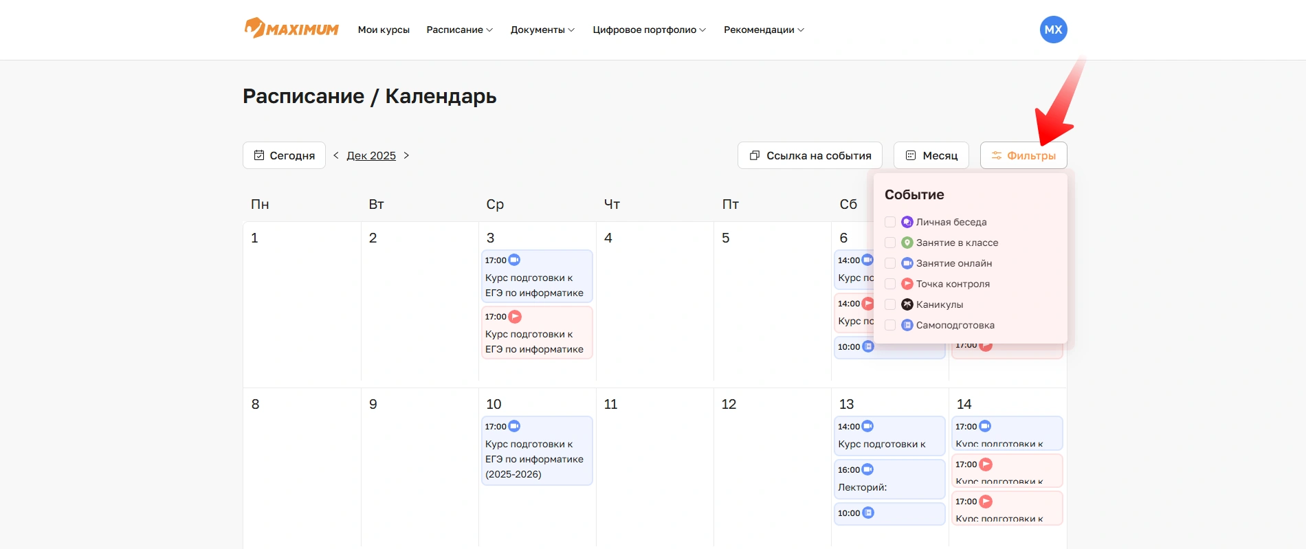 В фильтре можно выбрать какой формат активности отображать в календаре. Например, только Занятия онлайн.
