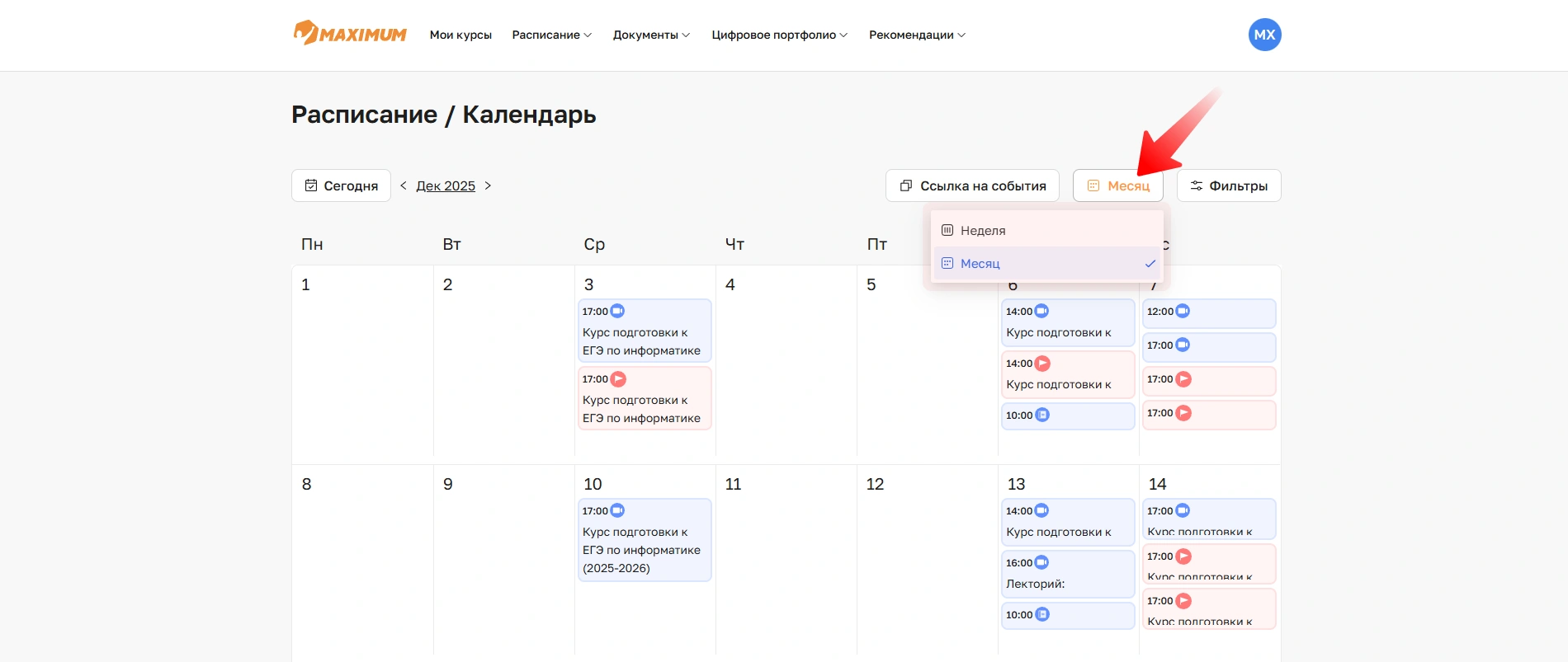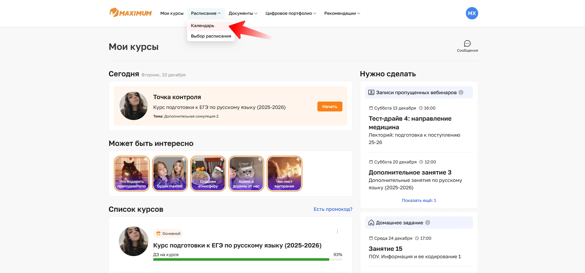 На главной странице личного кабинета необходимо выбрать раздел Расписание → Календарь.