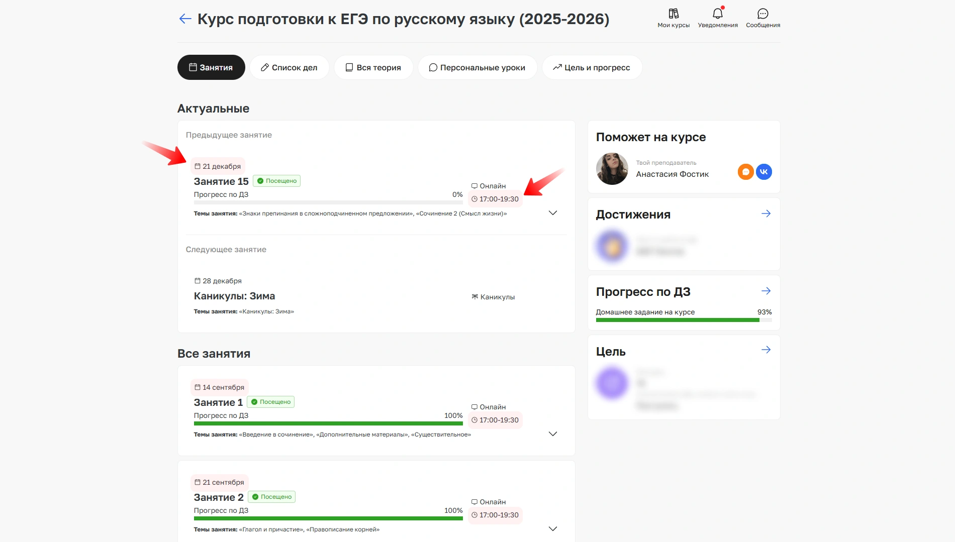 Дата занятия отображается над номером каждого занятия, а время справа у прогресса. В разделе Актуальные отображаются предыдущий и следующий уроки. В разделе Все занятия отображаются все уроки курса по порядку.