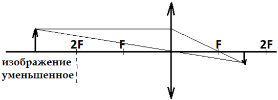 Предмет расположен за двойным фокусом линзы. Пример построения изображения предмета в виде стрелки: