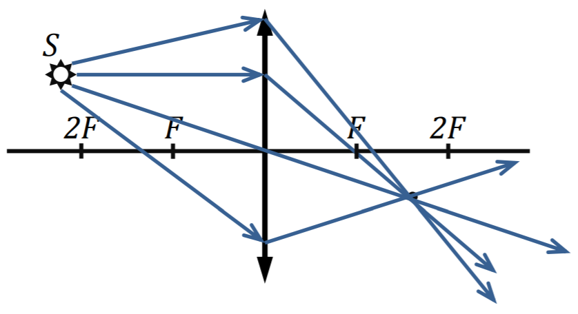 Лучи из источника света расходятся во все стороны. Преломляясь в линзе, все лучи сходятся в изображении источника света. На рисунке показаны лучи, выходящие из источника света S. Поскольку источник находится на расстоянии 2F от линзы ― то все лучи, преломившись в линзе, сходятся в его действительное изображение в точке 3.