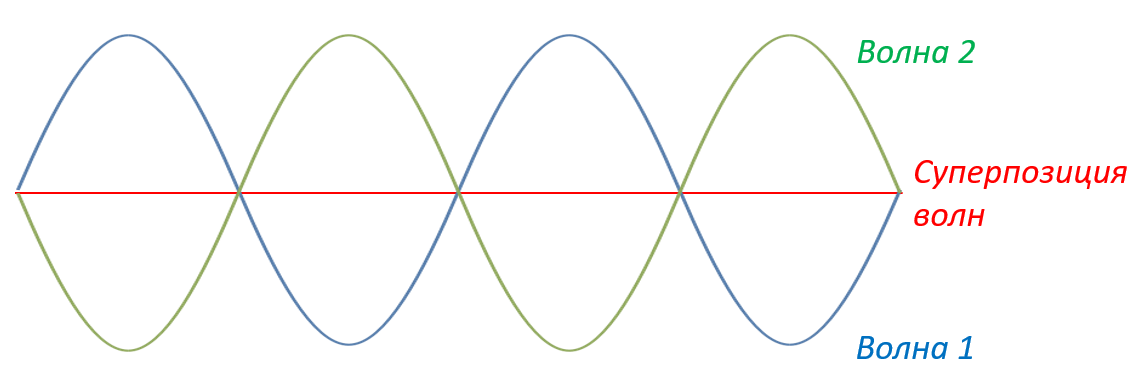 Если при сложении когерентных волн максимум одной волны совпадает с минимумом другой ― волны гасят друг друга и амплитуда результирующей волны равна нулю.
